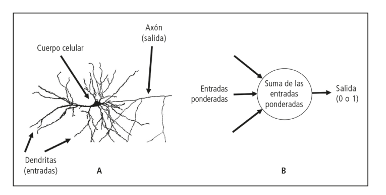 Para un informático (o, en el caso de Rosenblatt, un psicólogo), el procesamiento de la información en las neuronas puede simularse mediante un programa informático —un perceptrón— con varias entradas numéricas y una salida. En la figura superior se ilustra la analogía entre una neurona y un perceptrón. La figura 1A muestra una neurona, con sus dendritas ramificadas (las fibras que llevan las informaciones a la célula), el cuerpo celular y el axón (es decir, el canal de salida) etiquetados. La figura 1B muestra un perceptrón simple. El perceptrón, de forma análoga a la neurona, suma sus datos y, si la suma resultante es igual o superior al umbral del perceptrón, este emite el valor uno («se activa»); si no es así, emite el valor cero (no «se activa»). Para simular las distintas fuerzas de las conexiones a una neurona, Rosenblatt propuso que se asignara un peso numérico a cada una de las informaciones que entran en un perceptrón, de forma que cada elemento que entra se multiplica por su peso antes de añadirse a la suma. El umbral de un perceptrón no es más que un número establecido por el programador (o, como veremos, aprendido por el propio perceptrón).