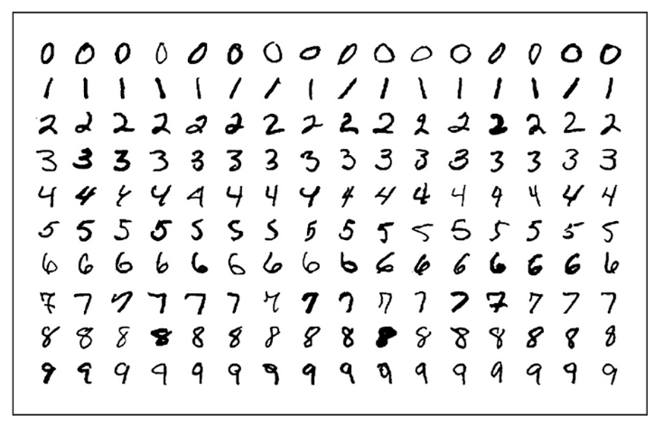Inspirándose en las redes de neuronas del cerebro, Rosenblatt propuso que las redes de perceptrones pudieran ejecutar tareas visuales como el reconocimiento de caras y objetos. Para hacernos una idea de cómo podrían hacerlo, vamos a ver cómo se podría usar un perceptrón para una tarea visual concreta: reconocer cifras manuscritas como las de la figura: