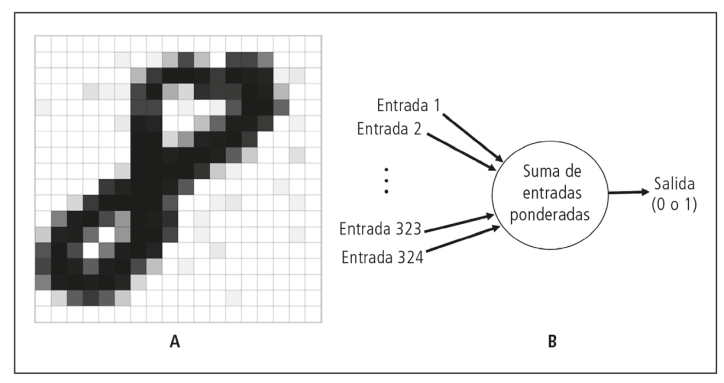 La figura inferior muestra un ocho manuscrito ampliado. Cada elemento de la cuadrícula es un píxel con un valor numérico de «intensidad»: los cuadrados blancos tienen una intensidad de cero, los negros de uno y los grises están entre los dos. Supongamos que las imágenes que damos a nuestro perceptrón se han ajustado para que tengan el mismo tamaño que esta: 18 × 18 píxeles. La figura 3B ilustra un perceptrón diseñado para reconocer los ochos. Este perceptrón tiene 324 entradas (es decir, 18 × 18), cada una de las cuales corresponde a uno de los píxeles de la cuadrícula de 18 × × 18 píxeles. En una imagen como la de la figura, cada entrada del perceptrón se ajusta a la intensidad del píxel correspondiente. Cada entrada tendría su propio valor de ponderación (no mostrado en la figura).