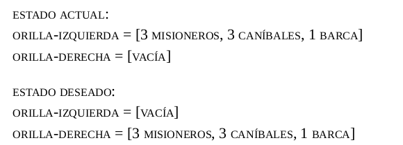 En lenguaje humano, estas líneas representan el hecho de que al principio la orilla izquierda del río «contiene» tres misioneros, tres caníbales y una barca, mientras que la orilla derecha no contiene nada de eso. El estado deseado representa el objetivo del programa: trasladar a todos a la orilla derecha del río.