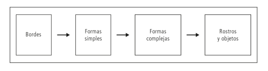 Hubel y Wiesel encontraron pruebas de que las neuronas de las distintas capas de esta jerarquía actúan como «detectoras» que reaccionan ante los elementos cada vez más complejos que aparecen en la escena visual, como muestra la figura superior: las neuronas de las primeras capas se activan (es decir, se disparan a mayor velocidad) en respuesta a los bordes; su activación alimenta las capas de neuronas que reaccionan ante formas simples compuestas por esos bordes; y así sucesivamente, hasta llegar a formas más complejas y, por último, a objetos enteros y rostros concretos. Obsérvese que las flechas de la figura superior indican un flujo de información ascendente (o hacia delante), que representa las conexiones desde las capas inferiores hacia las superiores (en la figura, de izquierda a derecha). Es importante señalar que en la corteza visual también se produce un flujo de información descendente o hacia atrás (de las capas superiores a las inferiores); de hecho, hay aproximadamente diez veces más conexiones descendentes que ascendentes. Sin embargo, los neurocientíficos no comprenden del todo la función de estas conexiones hacia atrás, aunque se sabe que los conocimientos y las expectativas previos, seguramente almacenados en capas cerebrales superiores, influyen mucho en lo que percibimos.
