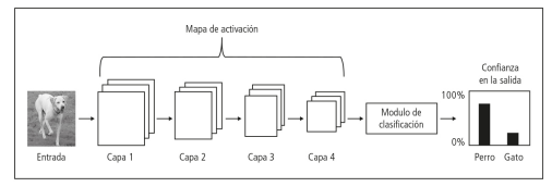 Para ser más concretos, imaginemos una ConvNet hipotética, con cuatro capas más un «módulo de clasificación», que queremos entrenar para reconocer perros y gatos en imágenes. Supongamos, para simplificar, que cada imagen de entrada representa exactamente un perro o un gato. La figura inferior ilustra la estructura de nuestra ConvNet. Es un poco complicada, así que vamos a repasarla con cuidado, paso a paso, para explicar cómo funciona