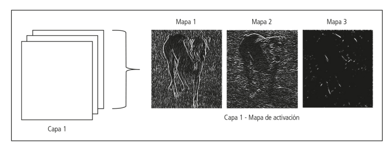 Obsérvese en la figura superior que cada capa de la red está representada por un conjunto de tres rectángulos superpuestos. Estos rectángulos representan mapas de activación, que se inspiran en «mapas» similares encontrados en el sistema visual del cerebro. Hubel y Wiesel descubrieron que las neuronas de las capas inferiores de la corteza visual están dispuestas físicamente de tal modo que forman más o menos una cuadrícula, en la que cada neurona reacciona a una pequeña zona correspondiente del campo visual. Imaginemos que estamos sobrevolando Los Ángeles de noche en avión y hacemos una foto; las luces que se ven en la foto forman un mapa aproximado de los elementos de la ciudad iluminada. De la misma forma, las activaciones de las neuronas de cada capa cuadriculada de la corteza visual forman un mapa aproximado de los elementos principales de la escena observada. Ahora imaginemos que tenemos una cámara especial, capaz de hacer fotos separadas de las luces domésticas, las luces de los edificios y las luces de los coches. Eso es más o menos lo que hace la corteza visual: cada elemento visual importante tiene su propio mapa neuronal. La combinación de estos mapas contribuye de forma esencial a nuestra percepción de una escena.