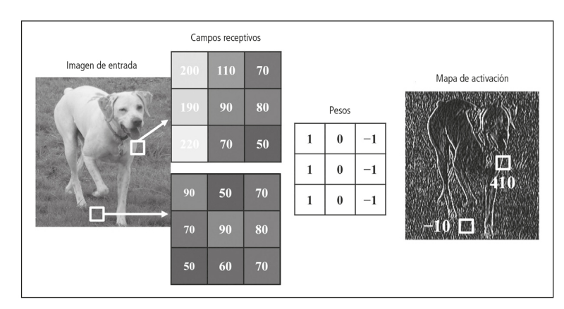 Los pesos que aparecen en la figura superior están pensados para generar una activación positiva elevada cuando hay un borde vertical entre claro y oscuro en el campo receptivo (es decir, un gran contraste entre los lados izquierdo y derecho del fragmento que llega a la neurona). El campo receptivo superior contiene un borde vertical: la piel clara del perro al lado de la hierba, más oscura. Eso se refleja en el valor elevado de activación (cuatrocientos diez). El campo receptivo inferior no contiene un borde así, solo hierba oscura, y la activación (menos diez) está más cerca de cero. Obsérvese que un borde vertical entre oscuro y claro producirá un valor negativo «elevado» (es decir, un valor negativo alejado de cero).