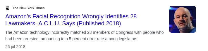 En 2018, la ACLU (American Civil Liberties Union) realizó una prueba del sistema de reconocimiento facial Rekognition de Amazon, y descubrió que identificó incorrectamente a 28 miembros del Congreso de los EE. UU. como criminales al compararlos con una base de datos pública de fotografías policiales. Los errores afectaron de manera desproporcionada a legisladores afroamericanos y latinos. El sistema mostró un sesgo racial al fallar más frecuentemente con personas de color que con individuos de piel clara.“Amazon’s Facial Recognition Wrongly Identifies 28 Lawmakers, A.C.L.U. Says”. “Amazon Puts 1-Year Ban on Police Use of its Biased Facial Recognition Software”