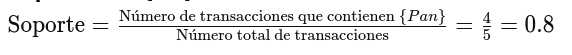 {Pan, Leche, Mantequilla}: 0.4 (Aparece en 2 de 5 transacciones) - Soporte de