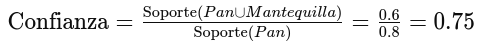 {Mantequilla}: 0.8 (Aparece en 4 de 5 transacciones) - Confianza: 0.6 / 0.8 = 0.75