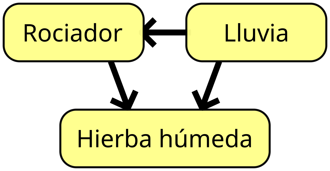 Una red Bayesiana simple. Influencia de la lluvia si el rociador está activado e influencia de la lluvia y el rociador si la hierba se encuentra húmeda.