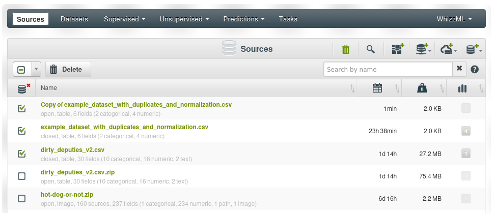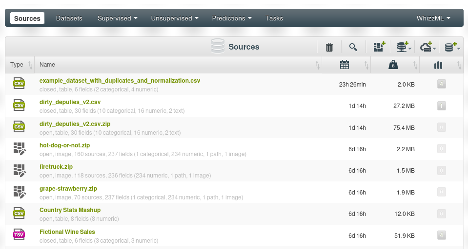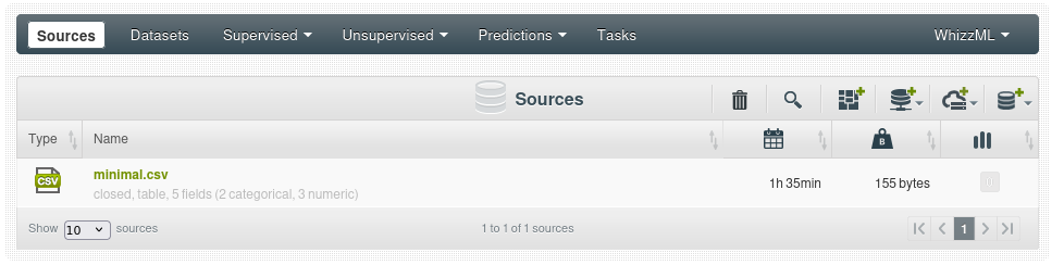 De cada fuente podemos visualizar su tipo (CSV, ZIP, etc), cuando fue creado, su tamaño o los datasets creados de esa fuente (puedes ordenar la lista por cualquiera de sus columnas).