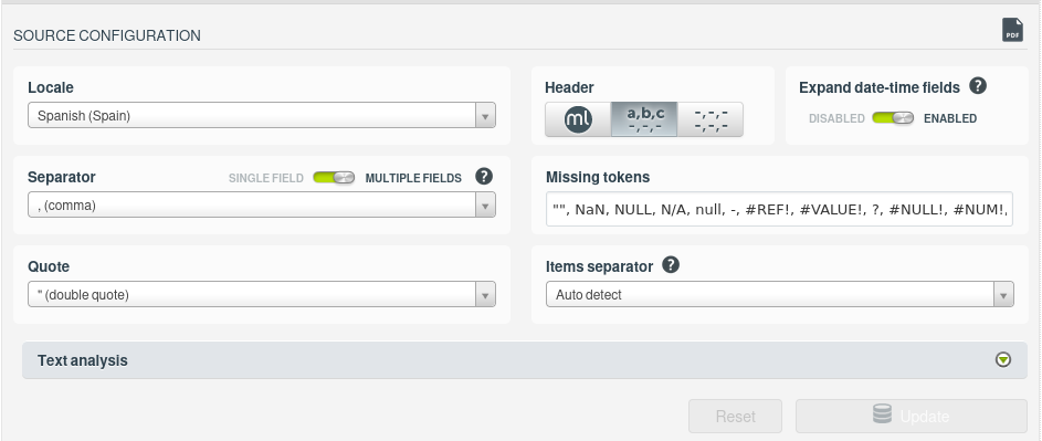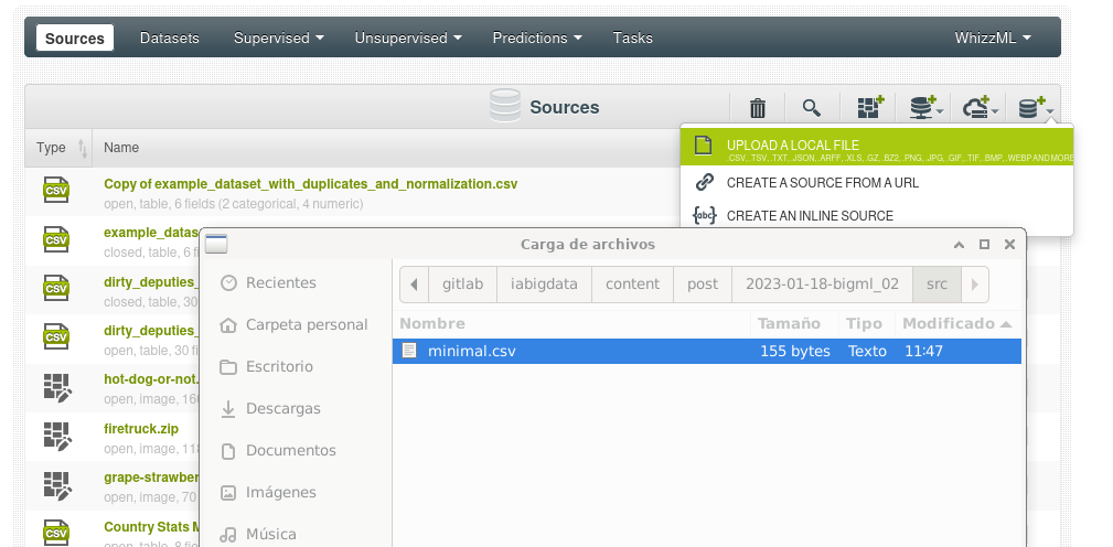 - Source (Fuente de Datos): Representa el archivo original de datos que se ha subido a BigML. Puede ser en formato CSV, JSON, Excel, entre otros. Es el punto de partida para crear otros recursos como Datasets