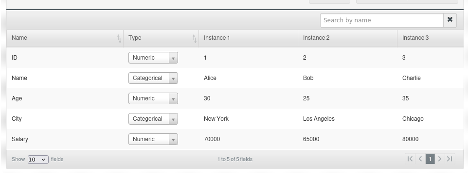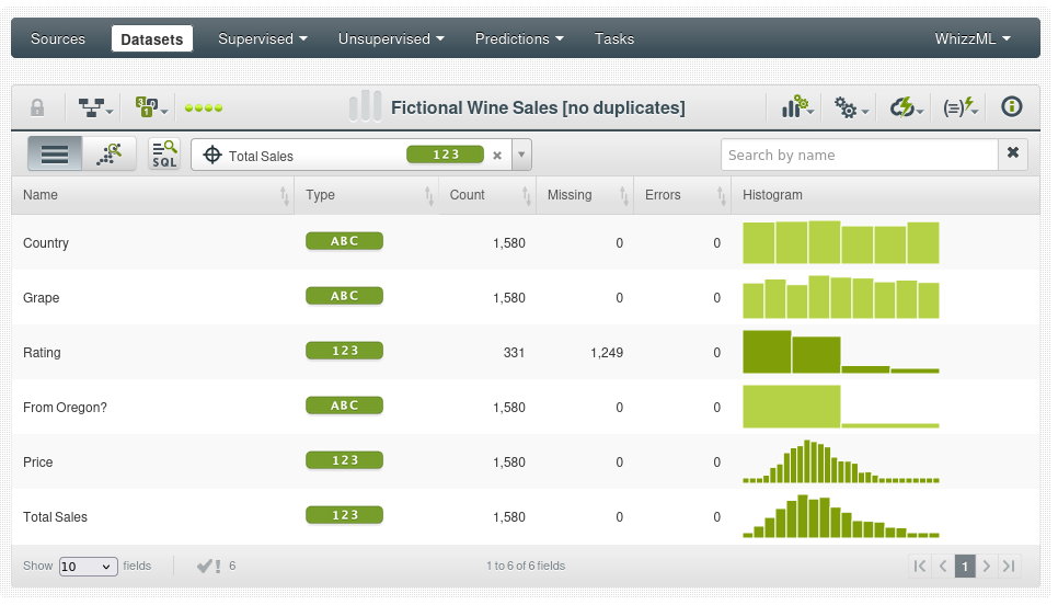 Esta lista muestra el tipo de datos para cada campo, BigML determina de forma automática durante la carga de datos a que tipo pertenece cada uno.