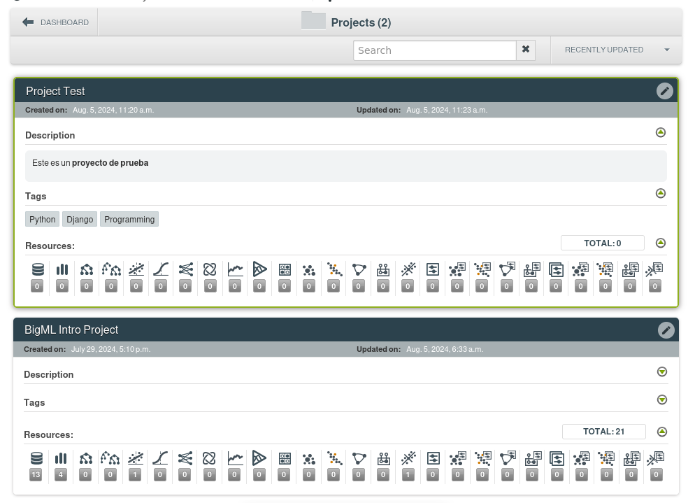 Aquí puedes ver el proyecto recién creado junto a otro que nos proporciona BigML de ejemplo al crear la cuenta: