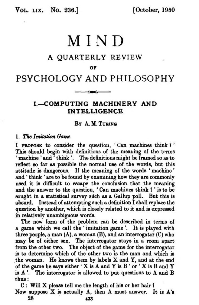 En el artículo Alan planteó un experimento mental, un juego que fue conocido como el Test de Turing. Su planteamiento era muy sencillo, el test involucraba tres participantes, una máquina y dos humanos, uno como entrevistador y otro como entrevistado. El interrogador debe determinar sin ver a ambos partícipes solo a través de preguntas, quién es la máquina y quién es la persona. El ordenador programado para hacer cualquier cosa para forzar una falsa identificación, puede mentir, puede jugar con las respuestas.