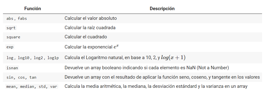 Las Universal functions (ufunc) son funciones que realizan operaciones elemento a elemento sobre datos en un ndarray.