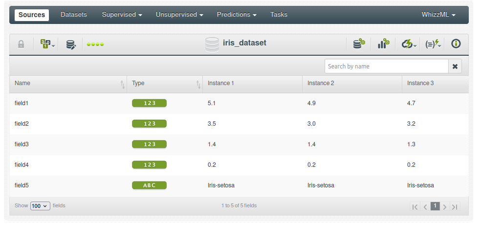 Notarás que los tipos de datos de atributos se han identificado correctamente como numéricos y que la etiqueta de clase es el último atributo (field5).
