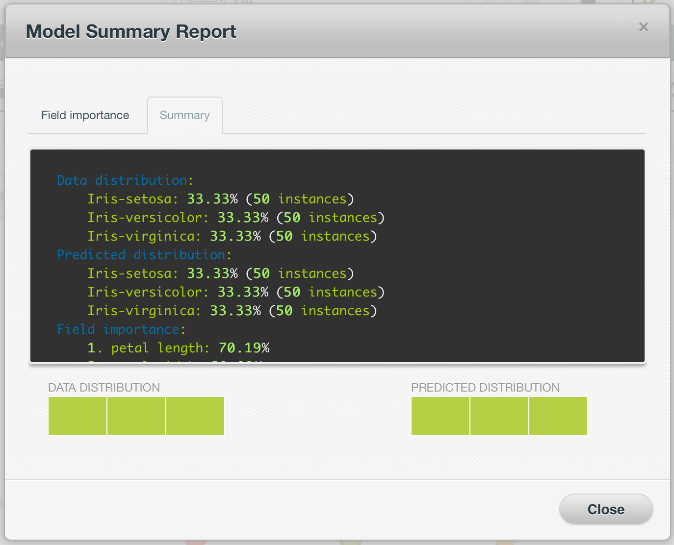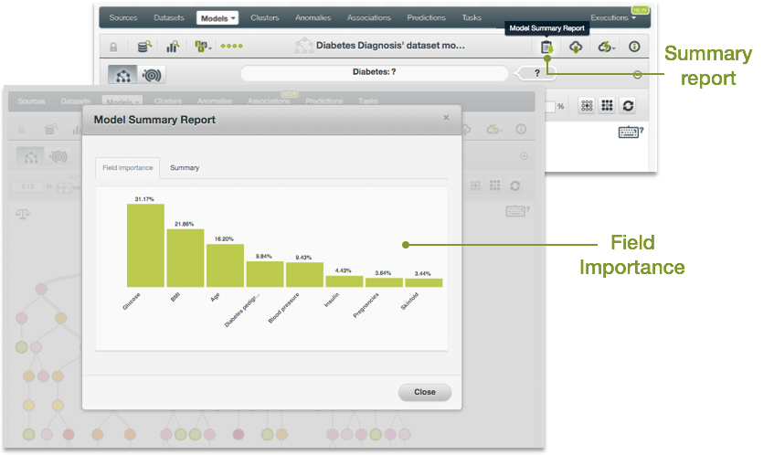 El informe de resumen del modelo tiene dos pestañas: importancia del campo y resumen, que se explican en las siguientes subsecciones.