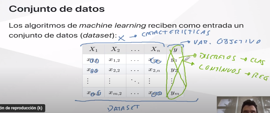 Nuestro dataset está formado por características (features) que son valores X, y la variable objetivo (etiqueta) comunmente llamada Y.