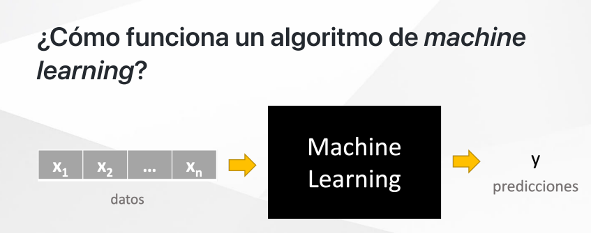 La información se la introduciremos al algoritmo de ML (se produce un ajuste o fit) y este será capaz de generar predicciones para nuevos datos de entrada.