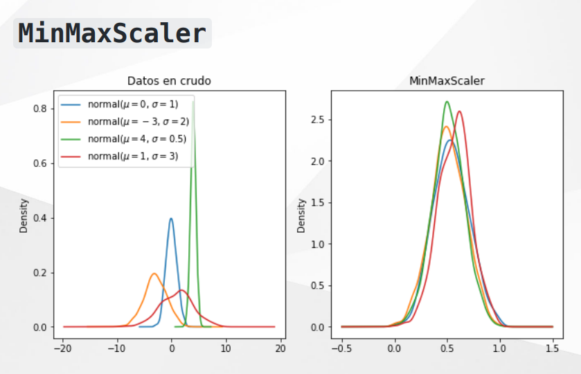 El escalador sklearn.preprocessing.MinMaxScaler transforma las características escalándolas a un rango dado, por defecto (0,1), aunque puede ser personalizado. Este tipo de escalado suele denominarse frecuentemente “escalado” de los datos.