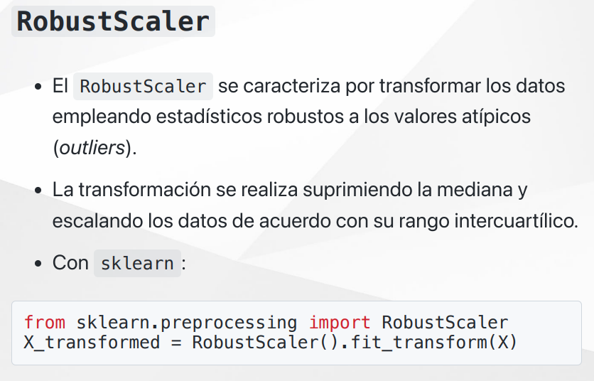 El escalador sklearn.preprocessing.RobustScaler aplica un escalado a las características de forma que sea más robusto a los valores atípicos o outliers.
