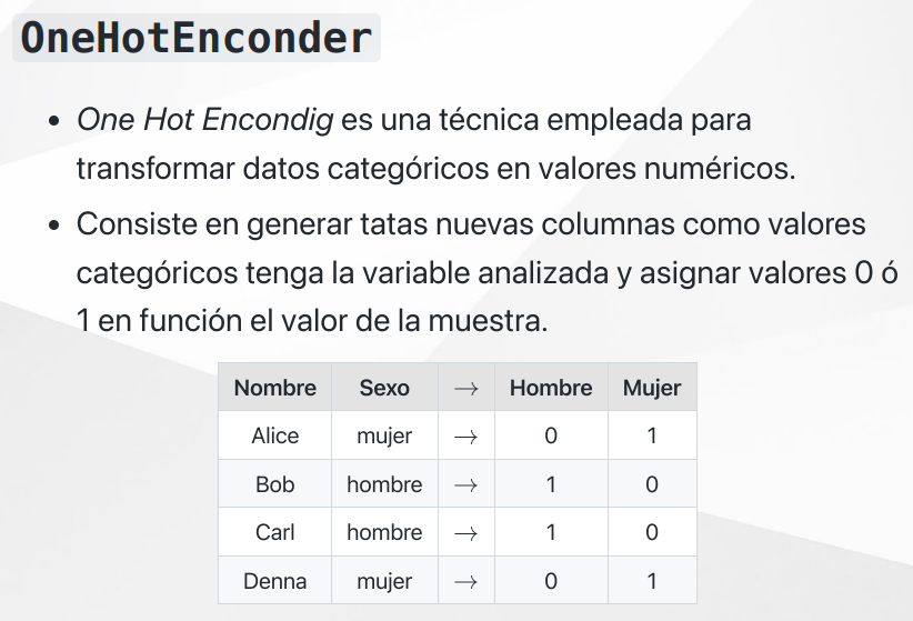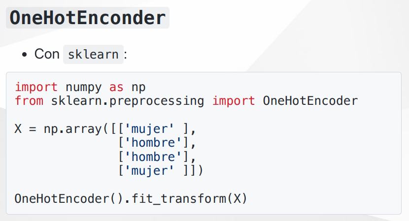 Recuerda que el OneHotEncoder solo funciona con datos categóricos. Si tienes características numéricas continuas, puedes necesitar utilizar otras técnicas de codificación o escalado antes de aplicar el OneHotEncoder.