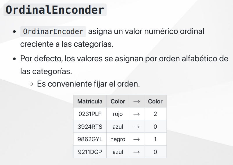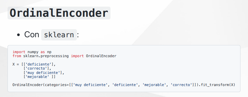 El OrdinalEncoder es útil cuando las categorías tienen un orden inherente, como en el caso de rangos o niveles, y deseas codificarlas según ese orden. Sin embargo, es importante tener en cuenta que el uso del OrdinalEncoder puede introducir un orden numérico artificial que podría afectar negativamente el rendimiento de algunos modelos de aprendizaje automático.