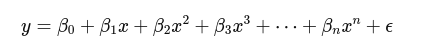 y: Variable dependiente (respuesta o salida del modelo).x: Variable independiente (entrada o predictor).β0: Intercepto o término constante.β1,β2,…,βn: Coeficientes del modelo que determinan la contribución de cada término x^k al valor de y.x^k: Potencias de la variable independiente, donde k=1,2,…,nϵ: Término de error o ruido, que captura la desviación entre los valores observados y los predichos por el modelo.